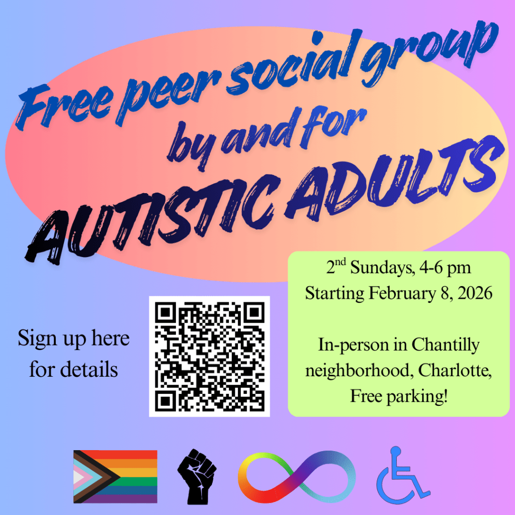 - Charlotte, NC area monthly in-person Autistic peer social group for ages 18+ (In Chantilly neighborhood and sign up required to receive address)